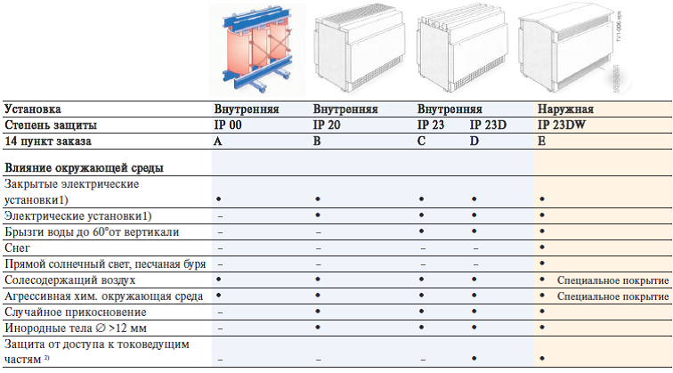 Экологический класс Е2. Климатическая категория оборудования С2. При наружной установке трансформатора обеспечивается исполнение IP 23. Класс пожаростойкости F1.