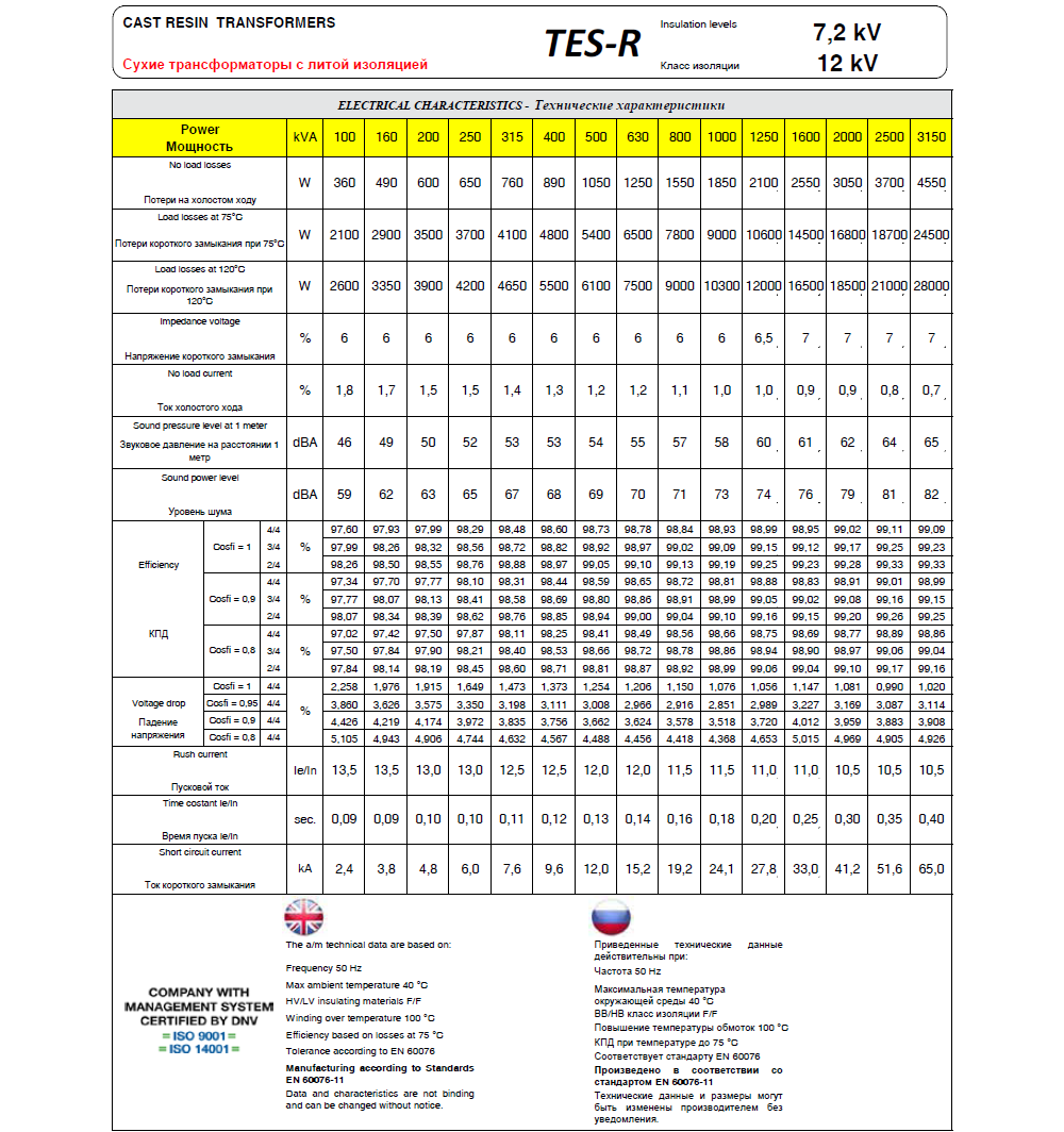 – Стандартная номинальная линейка от 25кВА до 30MVA и напряжением от 0,1кВ до 40кВ(включительно).